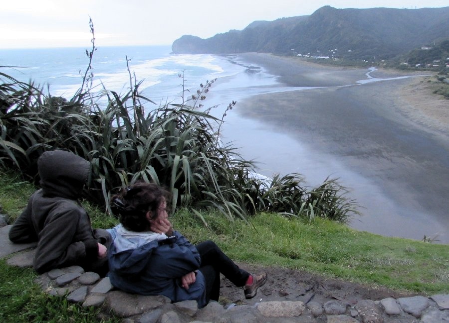 C’est le premier vrai départ en van et je laisse le volant aux autres non sans soulagement, encore trop impressionnés par la conduite à gauche. Les vans datent d’avant Jésus Christ et se traînent grave sur la route mais ici, on ne double pas ! Ben m’apprend que les véhicules lents doivent se ranger régulièrement sur le bas côté pour laisser passer les voitures qu’ils bloquent, ainsi devoir doubler quelqu’un est assez mal vu sur les routes. Nous voilà donc partis pour deux heures de route à nous arrêter toutes les dix minutes dans la joie et la bonne humeur. Le jeu en vaut la chandelle : la route débouche sur les hauteurs surplombant la plage de Piha, offrant un spectacle plutôt pas dégueu. On s’émerveille quelques minutes puis on descend explorer la plage.